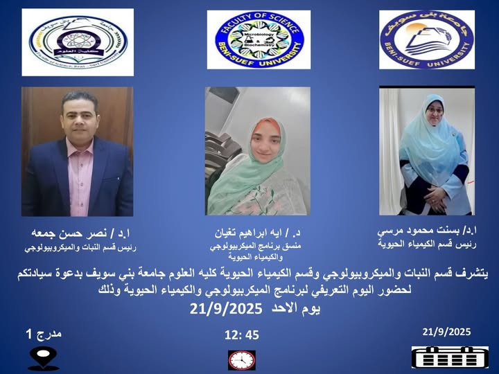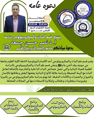 دعوة لحضور اليوم التعريفي لقسم النبات والميكروبيولوجي برئاسة أ. د/ نصر حسن جمعه