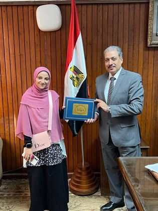 تهنئة عميد الكليةأ.د وائل نبيل حزين للدكتورة سماح عبدالمعطي الاستاذ المساعد بقسم الكيمياء لمنحها اللقب العلمي استاذ.